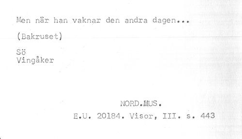 //// Men nar han vaknar den andra dagen... //// (Bakruset) //// - - - //// SÖ //// Vingåker //// NORD.MUS. //// E.U. 20184. Visor, III. s. 443 ////