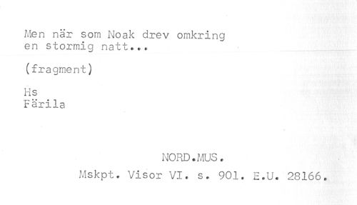 //// Men när som Noak drev omkring //// en stormig natt... //// (fragment) //// Hs //// Färila //// NORD. ms. //// Mskpt. Visor VI. s. 901. E.U. 28166. ////