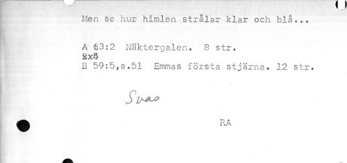 //// Men se hur himlen strålar klar och blå... //// ^ . - - - //// A 63:2 Näktergalen. 8 str. //// B 59:5,s.51 Emmas första stjärna. 12 str. ////