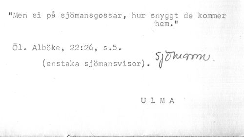 //// "Men si på sjömansgossar, hur snyggt de kommer //// *hem+" //// * //// Öl. Alböke, 22:26, s.5. //// (enstaka sjömansvisor) . J'' //// ULMA ////