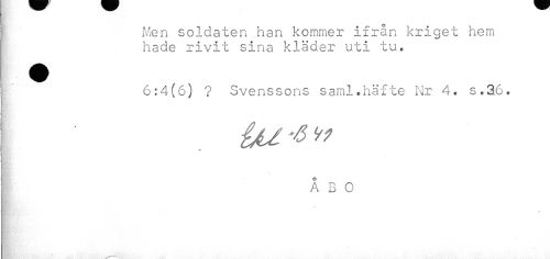//// O //// Men soldaten han kommer ifrån kriget hem //// hade rivit sina kläder uti tu, //// 6:4(6) ? Svenssons saml,häfte Nr 4. s.36. //// ÅBO ////