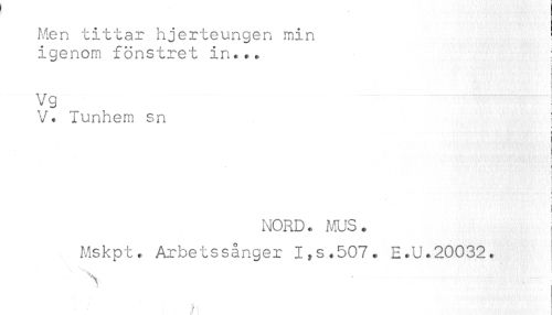 //// Men tittar hjerteungen min //// igenom fönstret in... ; //// t //// < //// Vg //// V. lunhem sn } //// * //// -i //// ) //// i //// ! //// : //// < //// ! //// NORD., MUS. //// ! //// < //// Mskpt. Arbetssånger I,s.507. E.U.20032. //// ** ] //// A //// / ^! ////