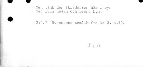 //// Men tänk den skräddaren här i byn //// med fula näsan och bruna hyn. //// h 2:4.? Svenssons saml.häfte Nr 3. s.19* //// ÅBO ////