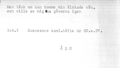 //// Men tänk om han komme min älskade vän, //// och ville av mig Mia gåvorna igen //// ^ - //// - //// * //// 3:4,? Svenssons saml.häfte Nr 20.S.37. //// * ' //// ÅBO ////