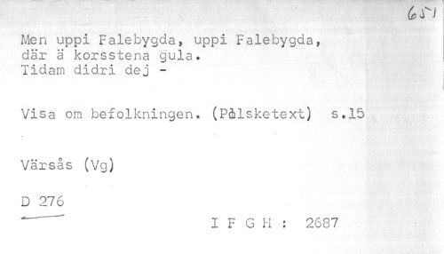 //// Men uppi Falebygda, uppi Falebygda, //// där ä korsstena gula. ! //// lidam didri dej - //// Visa om befolkningen. (P&lsketext) s.15 //// Värsås (Vg) //// D 276 //// " I F G H : 2687 ////