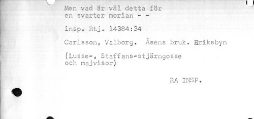//// I Men vad ar val detta tor //// en svarter morian - - //// insp. Rtj. 14384:34 //// o //// Carlsson^ Valborg. Åsens bruk. Rriksbyn //// (Lusse-; Staffans-stjärngosse //// och majvisor) //// RA INSP. ////