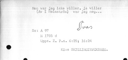 //// * * //// I Men var jag icke viller, ja viller //// (Av I Holmström) var jag nog... //// } Se: A 97 ^ //// ^ N 1735 d //// Upps. Z. P.s. 6:25; 16:24 ////