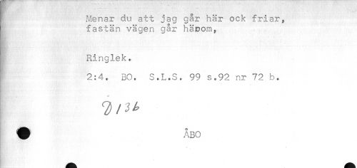 //// C/ T" A. t*' ' ' ' - ' !h, ' '7 - ' w / M ; ' ' , '* ? . '. -'<-' ' --' , - '. 'i*!'-,' . r? ;. //// Menar du att jag går här ock friar, //// fastän vägen går hä.Bom, //// ; Ringlek. //// ! 2:4. BO. S.L.S. 99 s.92 nr 72 b. ////