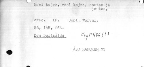 //// Meni kojra, veni kojra, soutas ja //// joutas, //// oreg. LF. Uppt. Wefvar. //// i R3, 165, 266. //// Den bortsålda Q^Wf?? //// ^ ÅBO RAi^CKEN MS ////