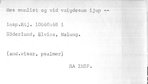 //// Mes munlist og vid vaigdesum ijup — //// insp.Rtj. 10660:68 i //// Söderlund, Elvina, Malung. //// (and.visor, psalmer) ^ //// RA INSP. I //// I ////