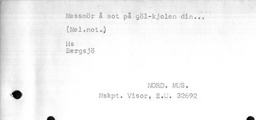 //// Messmör å sot på göl-kjolen din,.. //// * //// (Mel.not.) //// - //// Hs //// Bergsjö //// K/ ' //// : NORD. MUS. //// ^ Mskpt. Visor, E.U. 32692 ////