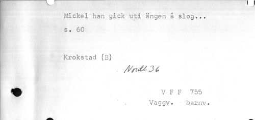 //// Mickel han gick uti ängen å slog... //// s. 60 //// Krokstad (B) //// ^ V F F 755 //// Vaggv. barnv. ////