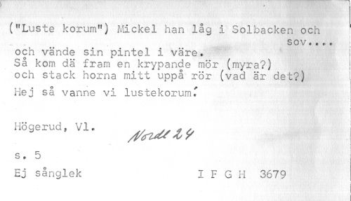 //// ("Luste korum") Mickel han låg i Solbacken och //// ... . SOV..,t ; //// och vände sin pintel i väre. I //// Så kom dä fram en krypande mör (myra?) I //// och stack hörna mitt uppå rör (vad är det?) ! //// Hej så vanne vi lustekorumf //// s. 5 //// Ej sånglek I F G H 3679 //// ! //// i ////