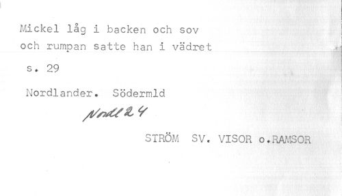 //// Mickel låg i backen och sov ! //// I //// * //// och rumpan satte han i vädret //// s„ 29 //// Nordlander. Södermld //// ' << //// < //// STRÖM SV. VISOR o.RAMSOR ////