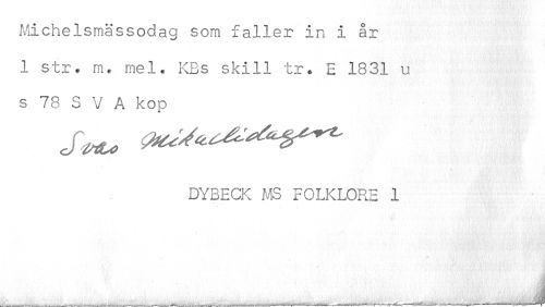 //// Michelsmässodag som faller in i år //// 1 str. m. mel. KBs skill tr. E 1831 u //// s 78 S V A kop //// DYBECK MS FOLKLORE 1 //// ... ......,J ////