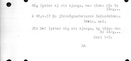 //// ^r Mig lyster ej att sjunga» men tiden här är //// p lång.*. //// B 48,s.l2 En järnvägsarbetares lefnadsöden. //// 34$tr. mel. //// Jfr Det lyster mig att sjunga» ty tiden den //// är lång... //// Kort 1-2. //// RA //// — - ^ ////