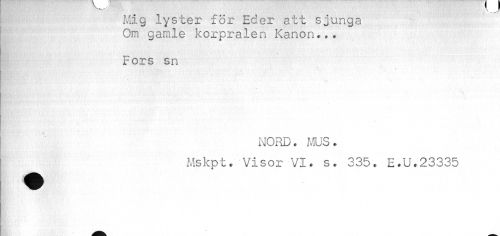 //// Mig lyster för Eder att sjunga Om gamle korpralen Kanon... //// Fors sn //// NORD. MUS. Mskpt. Visor VI. s. 335. E.U.23335 ////