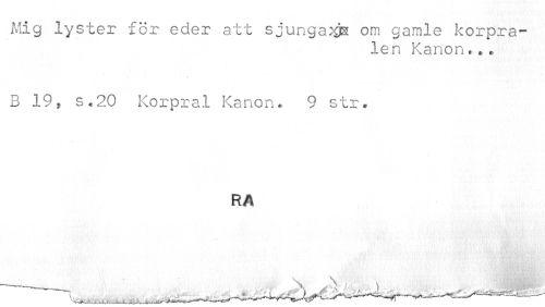 //// Mig lyster för eder att sjunga;^ om gamle korpralen Kanon... //// B 19» s.20 Korpral Kanon. 9 str. //// RA //// ¦ ////