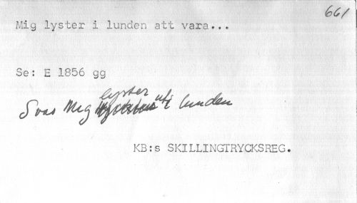//// Mig lyster i lunden att vara... Se: E 1856 gg //// KB:s SKILLINGTRYCKSREG. //// ¦ //// i ////