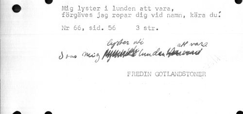 //// Mig lyster i lunden att vara, //// förgäves jag ropar dig vid namn, kära du T //// Nr 66, sid• 56 3 str. //// • v //// FREDIN GOTLANDSTONER //// • \ //// *t m . - « //// t //// ¦ ////