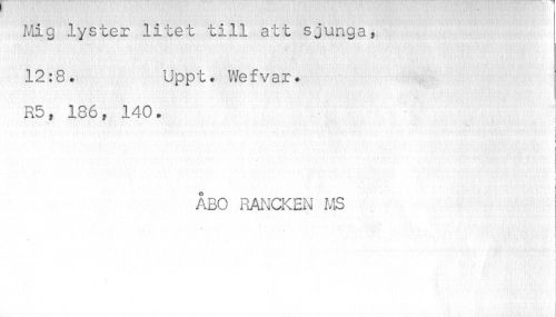 //// I? Mig lyster litet till att sjunga //// 12:8. Uppt. Wefvar. //// R5, 186t 140. //// \ //// ÅBO RANCKEN MS //// | ////