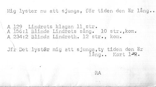 //// Mig lyster nu att sjunga, för tiden den är lång** //// \ A 129 Lindrots klagan lloStr* //// A 156:1 Blinde Lindrots sång. 10 str.,kom. //// A 234:2 Blinda Lindroth. 12 str*f korn. //// v //// \ > //// Jfr Det lyster mig att sjunga»ty tiden den är //// lång*. Kort lJf2. //// 0 //// RA ////