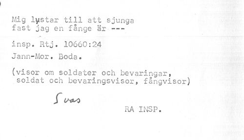 //// Mig lystar 'till att sjunga fast jag en fånge är —- //// insp. Rtj » 10660:24 Jann-Mor• Boda* //// (visor om soldater och bevaringar, soldat och bevaringsvisor* fångvisor) //// RA INSP. ////