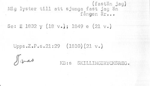 //// v ^ o ^ ^ //// /Mig lyster till att sjunga fast jag an //// fången är*.* //// Se: £ 1832 y (18 v*}; 1849 e (21 v.) //// Upps.Z.P.s.21:29 (1810)(21 v.) //// SKB: s S Kl L LI NGT RYCKS REG. //// i ////
