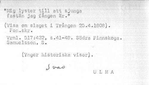 //// "Mig lyster till att sjunga fastän jag fången är.11 //// (Visa om slaget i Trången 25,4.1808). Fon.skr. //// Vrml. 517:432, s.41-48. Södra Finnskogs. Samuelsson, S„ //// (Ynger historiska visor). //// J iMX^O //// U L M A ////