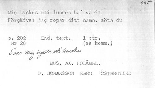 //// • • . ^ ' * y //// Mig tyckes uti lunden ha' varit //// Förgäfves jag ropar ditt namn, söta du i //// r //// s. 202 End. text. 1 str. //// Nr 28 (se komm.) j //// b //// sm* ty**1 ^ ^^ //// MUS, AK, FOLKMEL. //// i, //// P. JOHANSSON BERG ÖSTERGTLND //// I i //// i ////