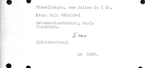 //// Mikaelidagen, som faller in i år. //// isnp. Rtj. 8866:2-3 //// % //// Rehnman-Lundeqvist» Maria Stockholm. //// BnEuMl • ¦ //// s //// (kärleksvisor) //// RA INSP. ////