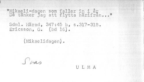//// "Mi.kaeli~dagen som faller in i åy Da tänker jag att flytta härifrån..." //// Sdml. Häradf 347:45 b, s.317-318. Ericsson, G. (bd 16). //// (Mikaelidagen) «• j //// 1 f IK.v. . &3RA! I //// { //// \ //// % //// I //// » //// i //// U L M A ////