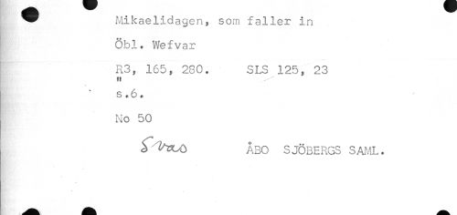//// 11 //// ~ Mikaelidagen, som faller in //// Öbl. Wefvar //// R3, 165, 280. SLS 125, 23 //// ii //// s.6. //// I No 50 //// f^foxA ÅBO SJÖBERGS SAML. //// 9 f ////