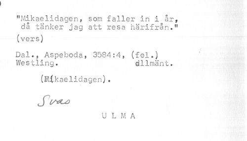 //// "Mikaelidagen, som faller in i årf då tänker jag att resa härifrån." //// (vers) //// Dal * * Aspeboda f 3584:4, (fol.) Wes 11i ng. d1Imä n t. //// (Mikaelidagen)? //// U L M A ////