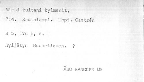 //// Miksi kultani kylmenit, //// 7:4* Rautalampi. Uppt. Castren //// « //// R 5, 176 b, 6. //// - //// I //// Hyljätyn Nuuhetlauen. ? //// i b //// V { //// I //// ÅBO RANCKEN MS //// : //// i ¦ //// » ////
