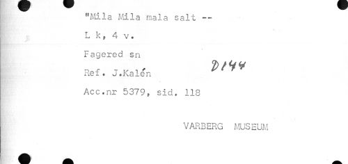 //// "Mila Mila mala salt --L k, 4 v. //// Fagered sn Rpf T K T //// Ref. J.Kålen Acc.nr 5379» sid. 118 //// VARBERG MUSEUM ////