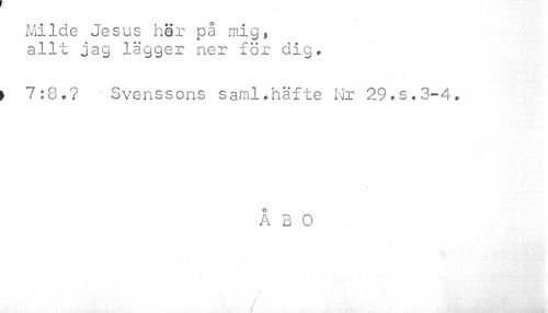 //// Milde Jesus här på mig, allt jag lägger ner för dig. //// I 7:8.? Svenssons saml.häfte Nr 29.s.3-4. //// ÅBO ////