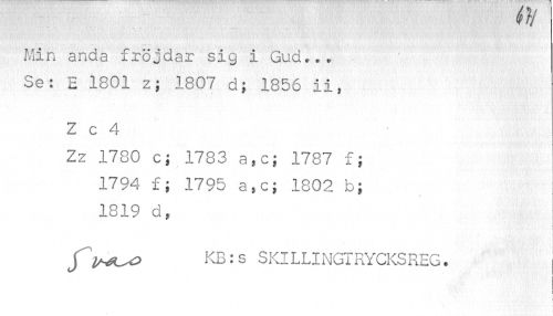 //// vrj //// Min anda fröjdar sig i Gud... Se: E 1801 z; 1807 d; 1856 ii, //// Z c 4 //// Zz 1780 c i 1783 a,c; 1787 f; //// 1794 f; 1795 a,c; 1802 b; i //// t //// 1819 d, //// ' ( //// JKB: s SKILLINGTRYCKSREG. //// i ////