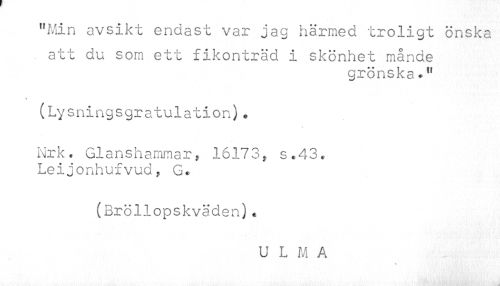 //// "Min avsikt endast var jag härmed troligt önska //// . att du som ett fikonträd i skönhet månde //// grönska *tt //// (Lysningsgratulation) * //// Nrk. Glanshammar, 16173, s«43* Leijonhufvud, Gc //// (Bröllopskväden)• //// U L M A //// % //// fciflf' ii '." nM ? 1 i . ; tå ////