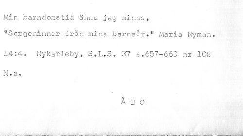 //// Min barndomstid ännu jag minns, "Sorgeminner från mina barnaårMaria Nyman. //// 14:4. Nykarleby, S.L.S. 37 s.657-660 nr 108 N. a . //// //// /ÅBO ////