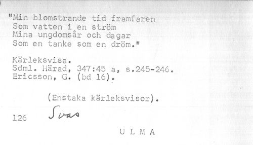 //// "Min blomstrande tid framfaren Som vatten i^en ström Mina ungdomsår och dagar //// Som en tanke som en dröm." //// Kärleksvisa. //// Sdml. Häradf 347:45 a, s.245-246. Ericsson» G. (bd 16). //// '" - M é f- .': -'V' ' //// (Enstaka kärleksvisor). //// 126 S //// U L M A ////