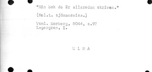 //// "Min bok de är allaredan skriven." (Mel.t. sjömansvisa•) //// Vsml. Norberg, 8044, s.97 Lagergren * E. //// U L M A ////