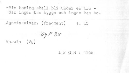 //// -Min boning skall bli under en bro -där ingen kan bygga och ingen kan bo. //// Agneta-visan, (fragment) s« 15 Varola (Vg) //// I F G H : 4166 ////