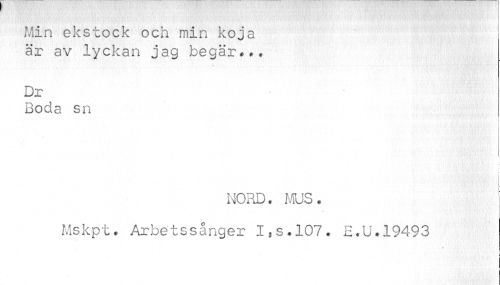 //// Min ekstock, och min koja är av lyckan jag begär*•• //// Dr //// Boda sn //// NORD. MUS. Mskpt. Arbetssånger I,s.107. E.U.19493 //// a ////