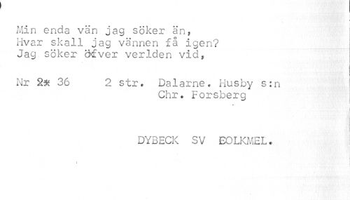 //// 1 //// Min enda vän jag söker än, Hvar skall jag vännen få igen? //// Jag söker afver verlden vid, //// i //// v 1 i i //// Nr 2* 36 2 str. Dalarne * Husby s:n //// Chr• Forsberg //// * //// ' v //// i'ii //// i //// | //// I //// DYBECK SV EOLKMEL. //// i ////