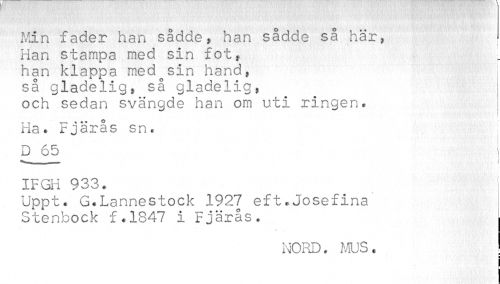 //// Min fader han sådde, han sådde så här, //// Han stampa med sin fot, //// han klappa med sin hand, //// så gladelig* så gladelig* //// och sedan svängde han om uti ringen. //// Ha. Fjärås sn. //// D 65 i //// IF Gli 933. //// Uppt. G.Lannestock 1927 eft.Josefina Stenbock f.1847 i Fjärås. //// nord. mus. ////