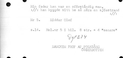 //// ^ Min fader han var en oförståndig man, //// ://: han byggde sitt bo så nära en sjöastrand //// Nr 5. Riddar Olof //// s.14. Mel.nr 5 i bil. 8 str. 4- 4 "senare11 //// ; 9fw //// RANCKEN PROF AF FOLKSÅNG //// ÖSTERBOTTEN ////