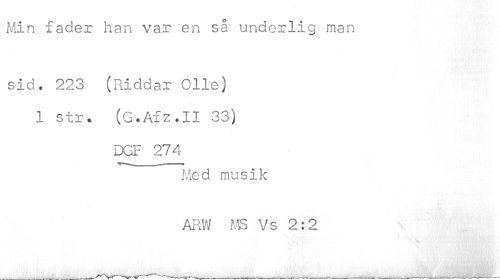 //// Min fader han var en så underlig man //// sid. 223 (Riddar Olle) 1 str. (G.Afz.II 33) //// DGF 274 //// Med musik ARW MS Vs 2:2 //// ^ t A . ÉM W J > ' v v i ......_ ^.r ,.-...t.,..¦ ////