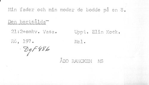 //// Min fader och min moder de bodde på en ö. //// Den bortsålda~ 21:2+omkv# Vasa» Upp t. Elin Kock. //// R6> 197. Mel. //// ÅBO RANCKEN MS //// \ ////