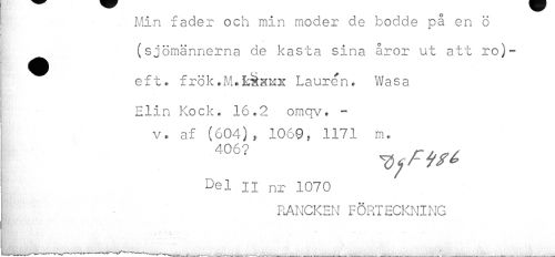 //// Min fader och min moder de bodde på en ö //// i //// //// /(sjömännerna de kasta sina åror ut att ro}-eft. frök.M»räÄMX Lauren* Wasa Elin Kock» 16»2 omqv» - //// ¦ //// v. af (604)f 1069, 1171 m. //// 406? r. //// °el II nr 1070 //// RANCKEN FÖRTECKNING ////
